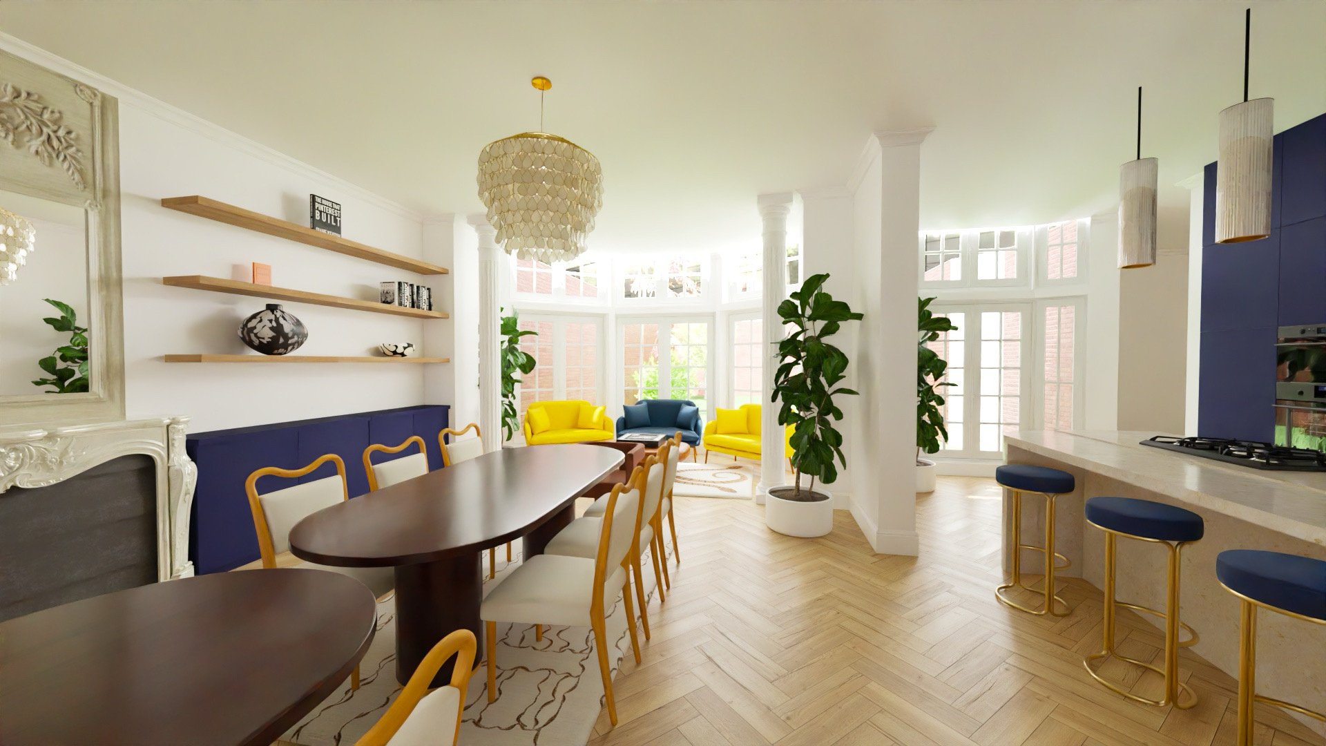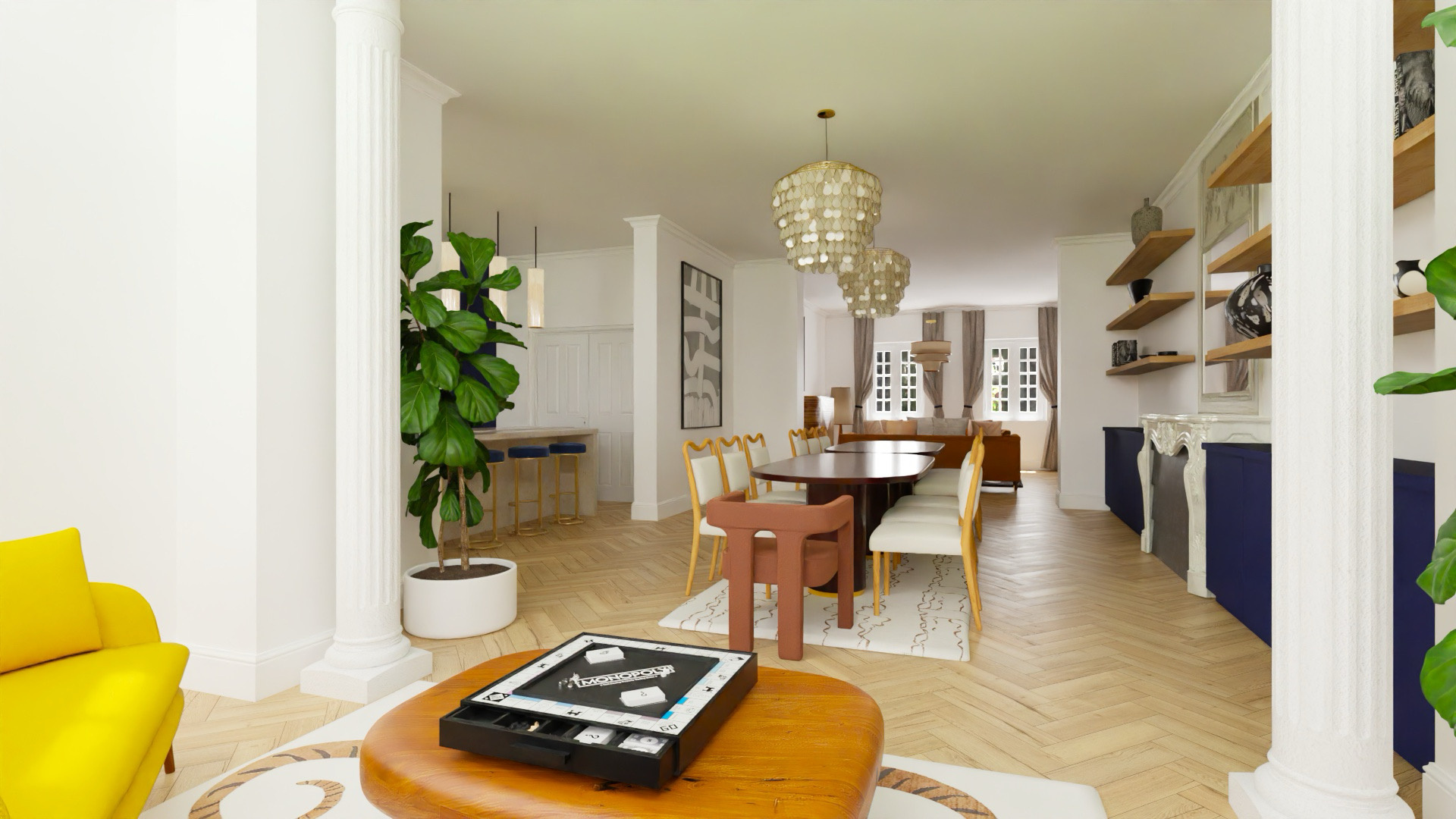 o Espaces Communs Majestueux (RDC) : Une cuisine de + de 20 m2 avec îlot central, salle à manger, bibliothèques et vastes salons ornés de colonnes corinthiennes et cheminées en marbre.