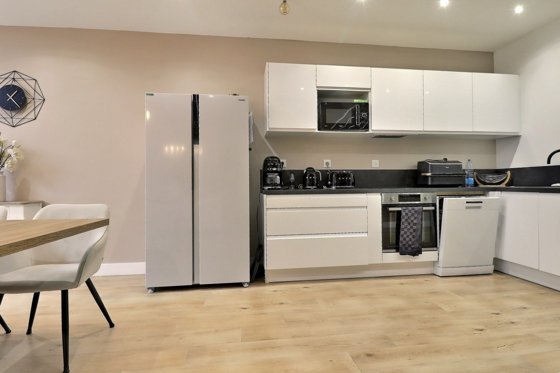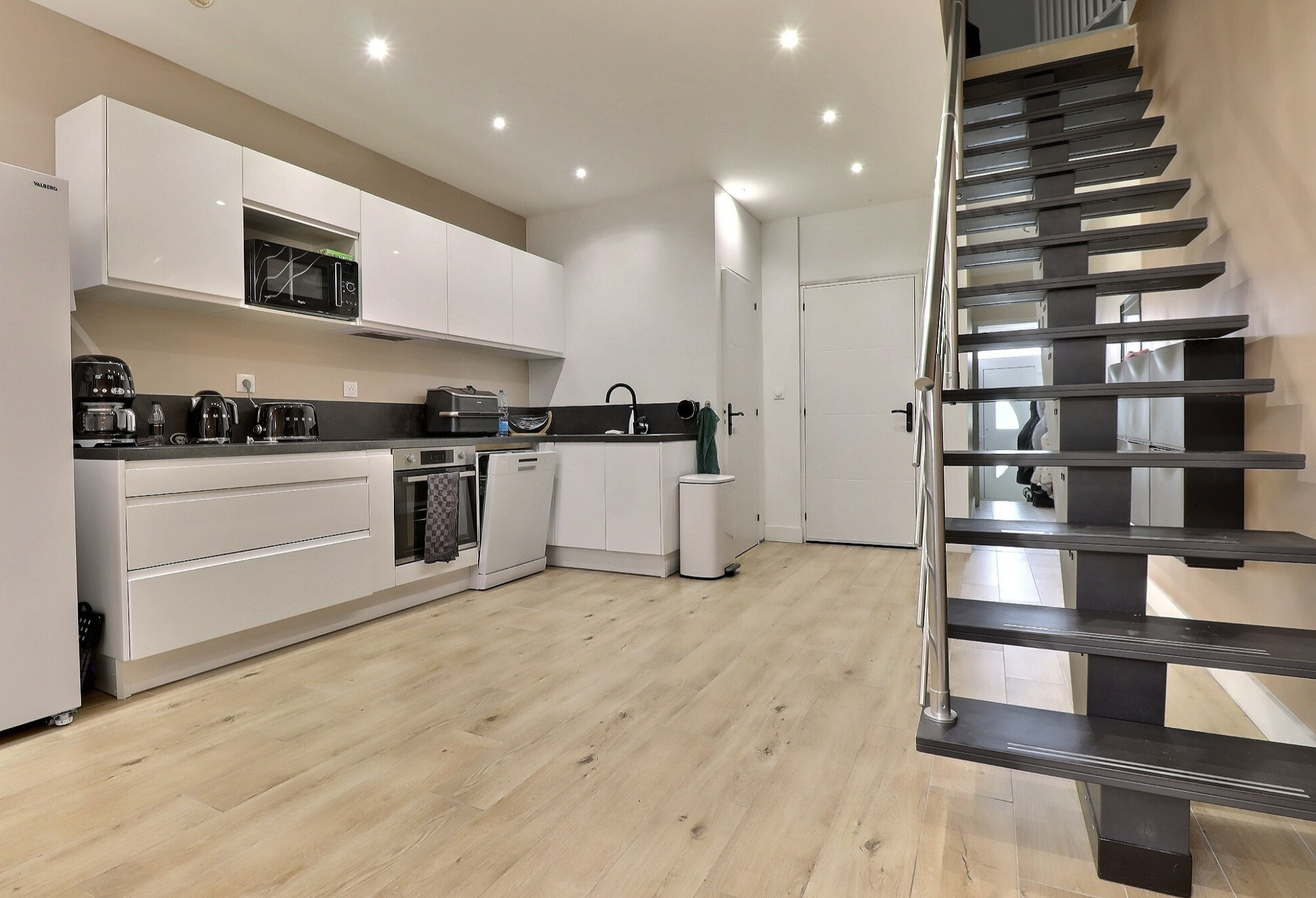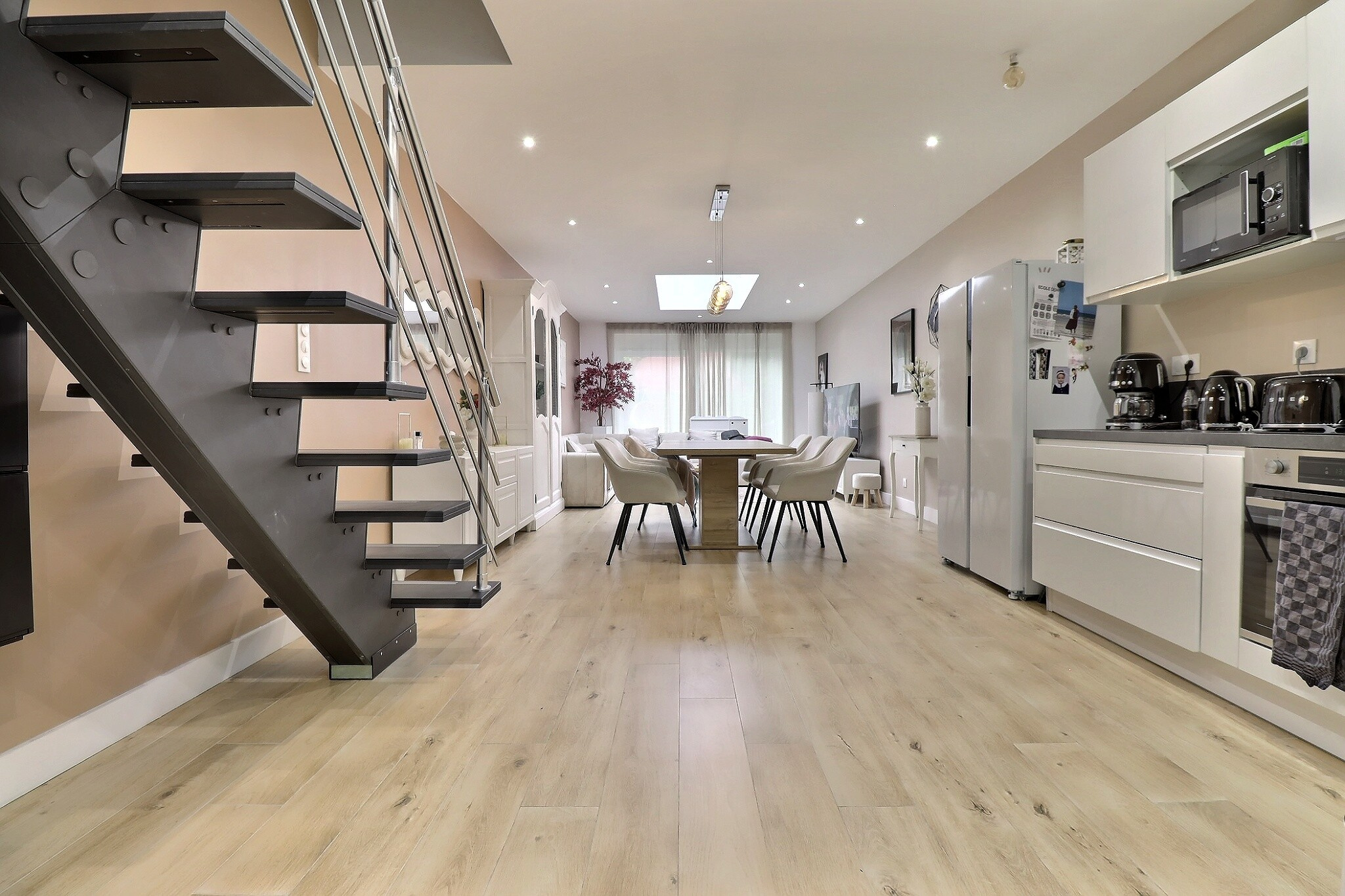Dés l’entrée, s’ouvre un long couloir qui donne accés à une cuisine équipée d’environs 13 m2 ouverte sur la salle à manger et le salon de presque 27 m2 entierement carrelée.