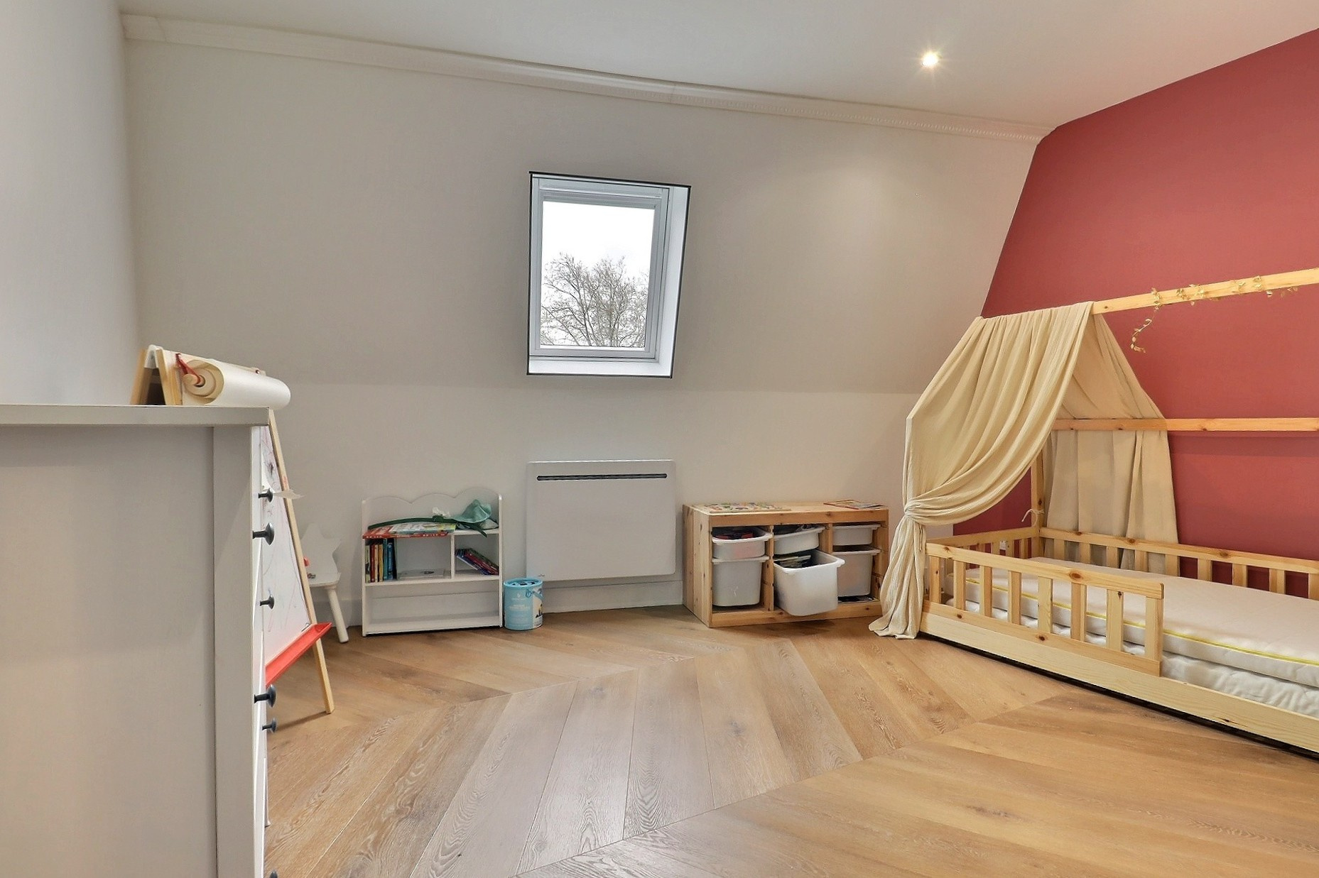 Vous accedez au second étage par un escalier en bois fait lui aussi sur mesure pour y découvrir deux chambre de 12.7 et 13.6 m2 entiérement parquétés en chevron.