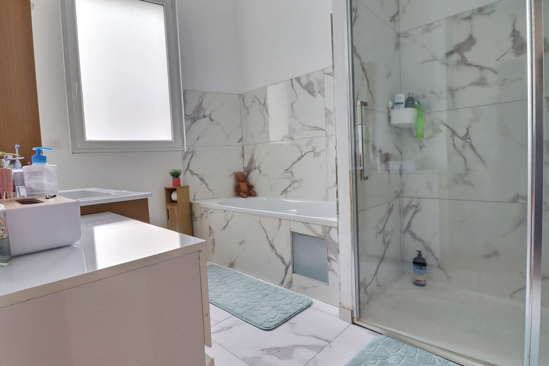 douche à l’italienne une vasque et un toilett et pour finir, une suite parentale de 18 m2 avec bouche à l’italienne et vasque.