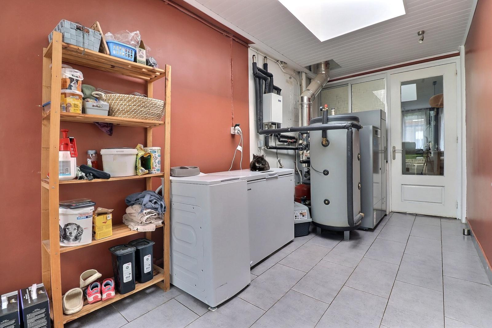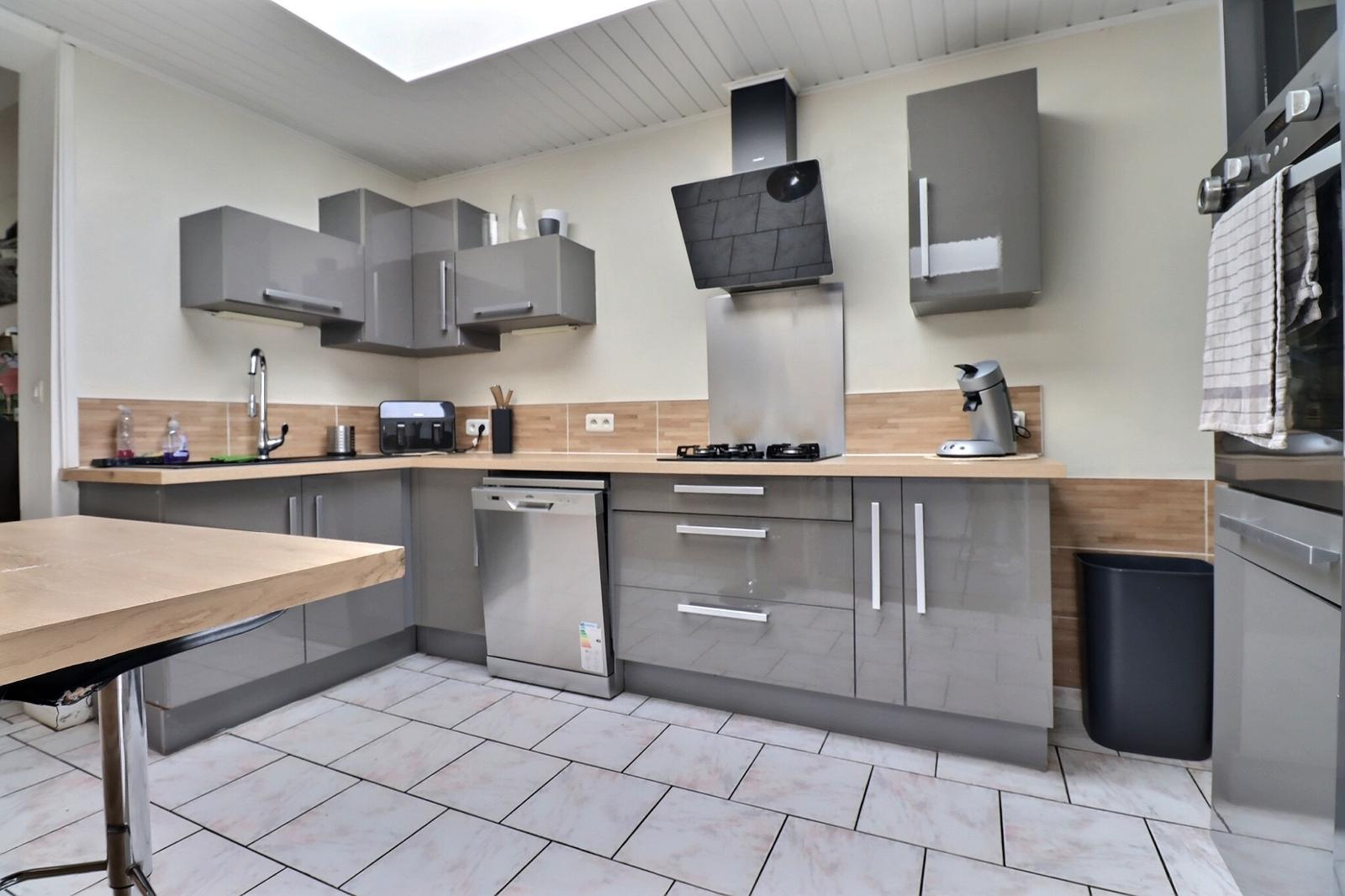La cuisine, entièrement équipée, offre des meubles laqués gris brillant, un plan de travail bois, une hotte aspirante, un lave-vaisselle et une plaque gaz. Fonctionnelle et design, elle ouvre sur une buanderie indépendante avec chaudière et accès au jardin.